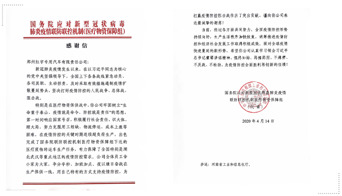 近日,中國兵器工業(yè)集團豫西集團鄭州紅宇專汽公司、一機集團和北重集團分別收到國務(wù)院應(yīng)對新型冠狀病毒肺炎疫情聯(lián)防聯(lián)控機制醫(yī)療物資保障組,包頭市青山區(qū)委、區(qū)政府發(fā)來的感謝信、慰問信,對他們在打贏疫情防控人民戰(zhàn)爭、總體戰(zhàn)、阻擊戰(zhàn)中作出的貢獻表示感謝。 豫西集團鄭州紅宇專汽公司收到國務(wù)院聯(lián)防聯(lián)控機制感謝信 4月14日,國務(wù)院應(yīng)對新型冠狀病毒肺炎疫情聯(lián)防聯(lián)控機制醫(yī)療物資保障組向中國兵器工業(yè)集團豫西集團鄭州紅宇專汽公司發(fā)來感謝信。 豫西集團鄭州紅宇專汽公司收到國務(wù)院應(yīng)對新型冠狀病毒肺炎疫情聯(lián)防聯(lián)控機制醫(yī)療物資保障組發(fā)來的感謝信 信中指出,新冠肺炎疫情發(fā)生以來,在以習近平同志為核心的黨中央堅強領(lǐng)導下,全國上下各條戰(zhàn)線緊急動員、各司其職、主動擔責,及時采取有效措施遏制疫情擴散蔓延勢頭,堅決打好疫情防控的人民戰(zhàn)爭、總體戰(zhàn)、阻擊戰(zhàn)。 特別是在醫(yī)療物資保供戰(zhàn)中,鄭州紅宇專汽公司牢固樹立“生命重于泰山、疫情就是命令、防控就是責任”的思想,第一時間響應(yīng)國家號召,積極履行社會責任,識大體、顧大局,努力克服用工短缺、物流停運、成本上漲等困難,在疫情防控的關(guān)鍵時期連續(xù)超負荷生產(chǎn),出色完成了國務(wù)院聯(lián)防聯(lián)控機制醫(yī)療物資保障組下達的醫(yī)療廢物轉(zhuǎn)運車生產(chǎn)任務(wù),有力保障了全國特別是湖北武漢等重點地區(qū)的疫情防控需求。公司全體員工舍小家為大家、爭分奪秒、加班加點,夜以繼日奮戰(zhàn)在生產(chǎn)保供一線,用自己特有的方式支持疫情防控,為打贏疫情防控阻擊戰(zhàn)作出了突出貢獻。 鄭州紅宇專汽公司緊急生產(chǎn)醫(yī)療廢物轉(zhuǎn)運車并及時發(fā)運 疫情發(fā)生以來,鄭州紅宇專汽公司已簽約醫(yī)療廢物轉(zhuǎn)運車107臺,累計下線90臺,交付83臺。 一機集團和北重集團收到中共包頭市青山區(qū)委員會、青山區(qū)人民政府發(fā)來的感謝信和慰問信 4月13日,中共包頭市青山區(qū)委員會、青山區(qū)人民政府向中國兵器工業(yè)集團一機集團和北重集團發(fā)來感謝信和慰問信,對參與青山區(qū)防控疫情一線工作的一機集團、北重集團黨員干部職工及給予充分理解、全力支持的家屬們,表示衷心的感謝并致以最崇高的敬意!