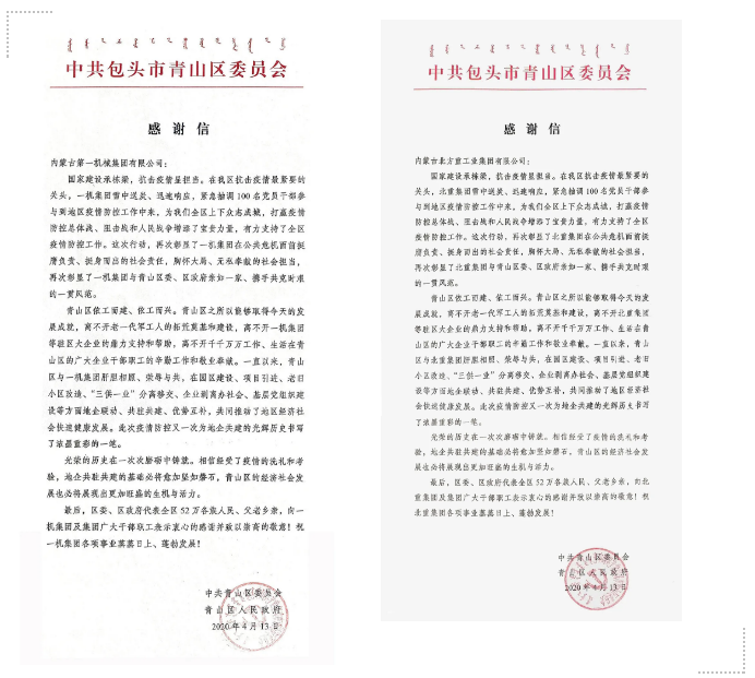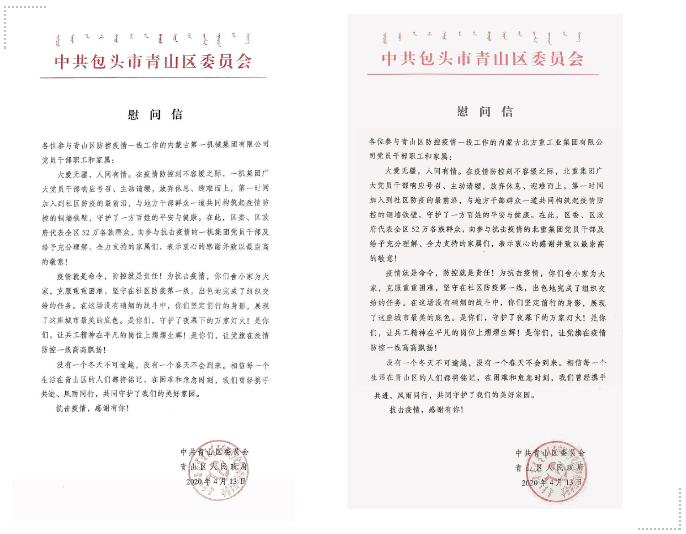 一機集團、北重集團收到中共包頭市青山區(qū)委員會、青山區(qū)人民政府發(fā)來的慰問信 信中指出,在青山區(qū)抗擊疫情最緊要的關(guān)頭,一機集團、北重集團雪中送炭、迅速響應(yīng),分別緊急抽調(diào)百余名黨員干部參與到地區(qū)疫情防控工作中,為全區(qū)上下眾志成城,打贏疫情防控的人民戰(zhàn)爭、總體戰(zhàn)、阻擊戰(zhàn)增添了寶貴力量,有力支持了全區(qū)疫情防控工作,彰顯了一機集團、北重集團在公共危機面前挺膺負責、挺身而出的社會責任,胸懷大局、無私奉獻的社會擔當。 一機集團黨員干部馳援青山區(qū)疫情防控一線 北重集團黨員干部馳援青山區(qū)疫情防控一線 來源/豫西集團紅宇專汽公司、一機集團、北重集團