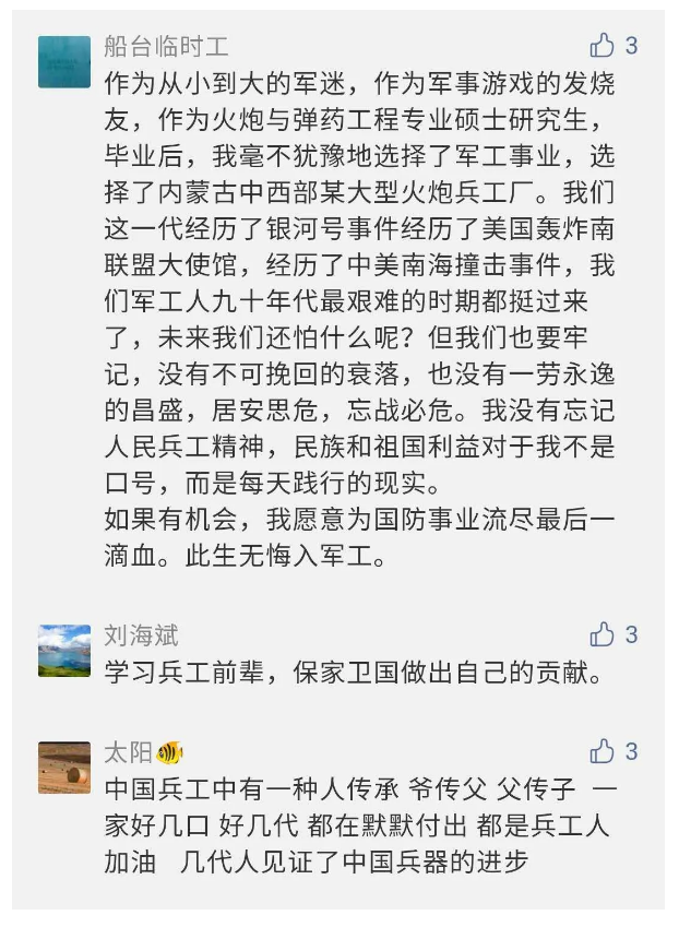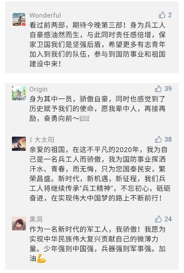 在中國(guó)共產(chǎn)黨成立九十九周年之際,由中國(guó)兵器工業(yè)集團(tuán)有限公司組織攝制、反映人民兵工在黨的領(lǐng)導(dǎo)下80余年光輝奮斗歷程、廣大兵工人弘揚(yáng)“把一切獻(xiàn)給黨”人民兵工精神的三集紀(jì)錄片《人民兵工》自7月1日-3日每晚20點(diǎn)在中央廣播電視總臺(tái)中文國(guó)際頻道(CCTV-4)《國(guó)家記憶》首播以來(lái),在兵器系統(tǒng)和觀眾中引發(fā)強(qiáng)烈反響,很多網(wǎng)友、觀眾紛紛留言表達(dá)了自己的觀后感受。 觀眾在兵器工業(yè)集團(tuán)官微的留言區(qū)直抒了觀影感受,有的熱淚盈眶,有的心潮起伏,有的興起賦詩(shī),有的認(rèn)為讓心靈得到凈化、思想得以提升,有的認(rèn)為是最直觀的國(guó)防教育教材......