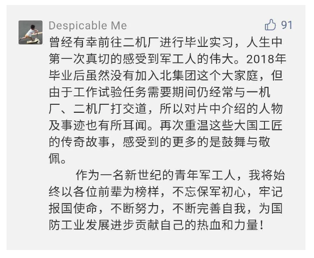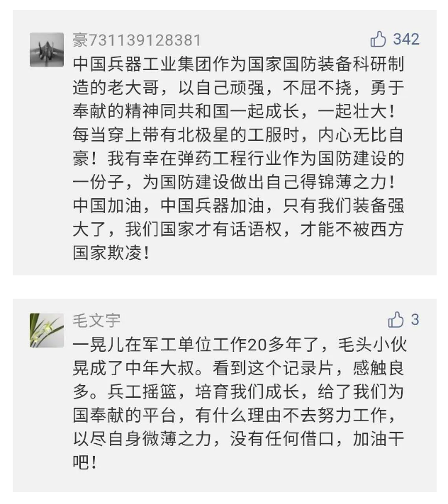 作為新時(shí)代弘揚(yáng)人民兵工精神的特色文化成果,紀(jì)錄片的播出,凝聚起廣大兵器干部職工團(tuán)結(jié)奮斗新時(shí)代磅礴力量,極大的增強(qiáng)了兵工人的自豪感,大家紛紛表達(dá)了作為軍工央企一員 “此生無(wú)悔入軍工”的使命擔(dān)當(dāng)......