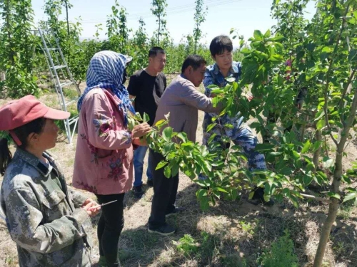王躍(右一)指導(dǎo)村集體經(jīng)濟果園工人稀果