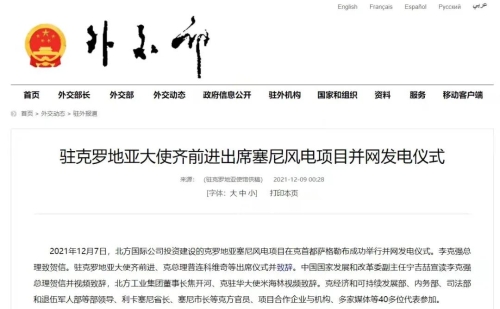 2021年12月7日,中國兵器工業(yè)集團有限公司北方公司所屬北方國際投資、建設和運營的塞尼156MW風電項目在克羅地亞首都薩格勒布隆重舉行并網(wǎng)發(fā)電儀式。李克強總理致賀信。克羅地亞總理安德烈·普連科維奇,中國駐克羅地亞大使齊前進出席儀式并致辭。中國國家發(fā)展和改革委員會副主任寧吉喆宣讀李克強總理賀信并視頻致辭,中國兵器工業(yè)集團有限公司董事長焦開河、克駐華大使米海林視頻致辭。