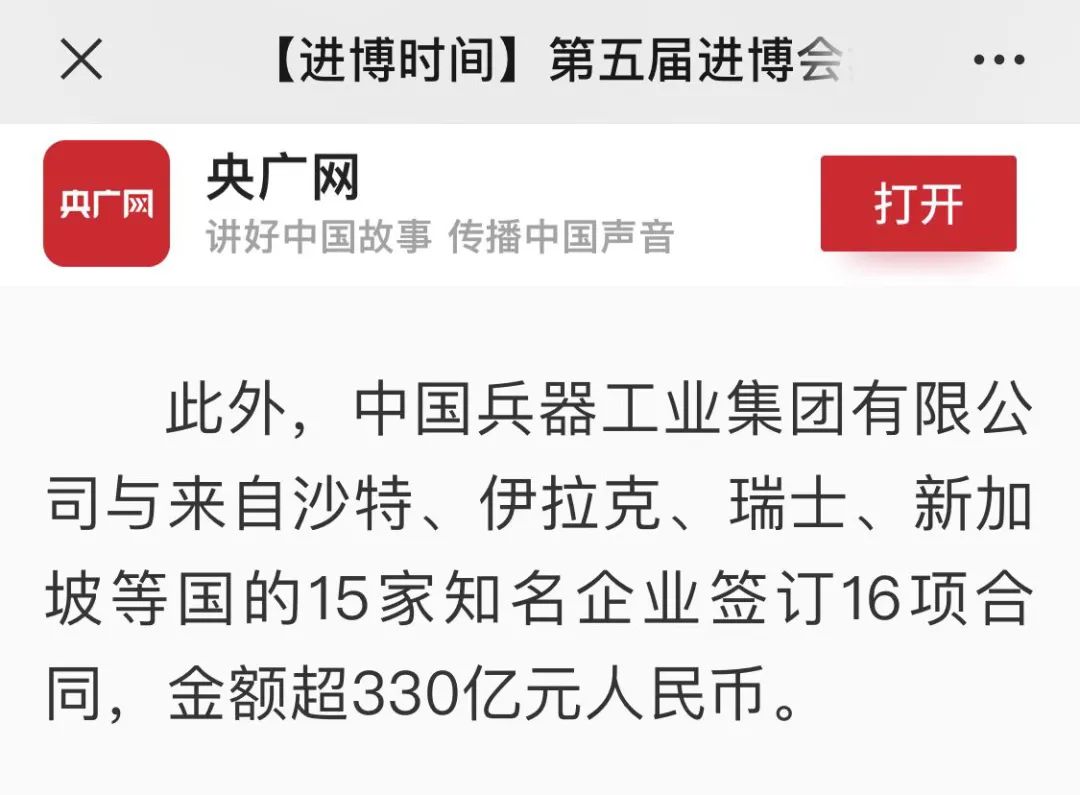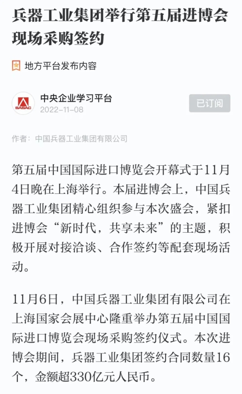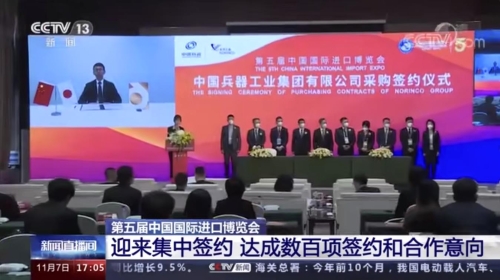北京時(shí)間:第五屆進(jìn)博會(huì):兵器工業(yè)集團(tuán)現(xiàn)場(chǎng)采購(gòu)簽約金額超330億元人民幣