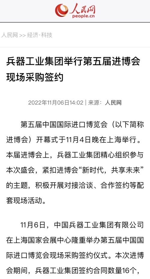 人民網(wǎng):兵器工業(yè)集團(tuán)舉行第五屆進(jìn)博會(huì)現(xiàn)場(chǎng)采購(gòu)簽約