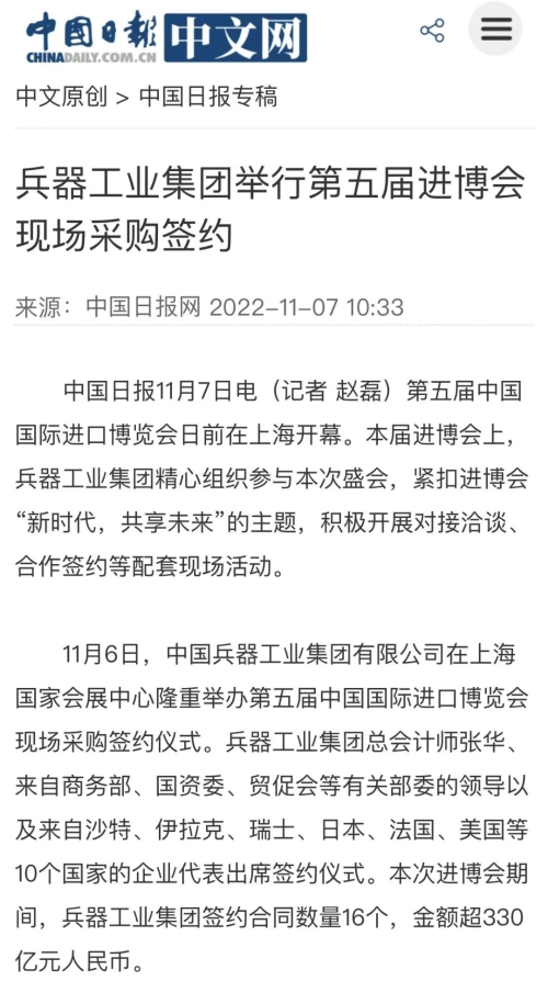 中國(guó)日?qǐng)?bào)網(wǎng):兵器工業(yè)集團(tuán)舉行第五屆進(jìn)博會(huì)現(xiàn)場(chǎng)采購(gòu)簽約