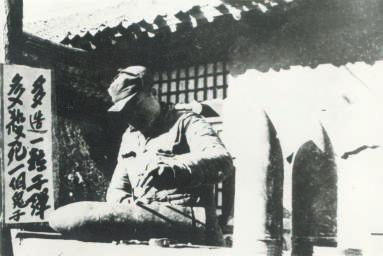 ▲抗日戰(zhàn)爭時期,晉察冀軍區(qū)技術(shù)人員在拆卸炮彈。旁邊的標(biāo)語為:多造一粒子彈,多殺死一個鬼子