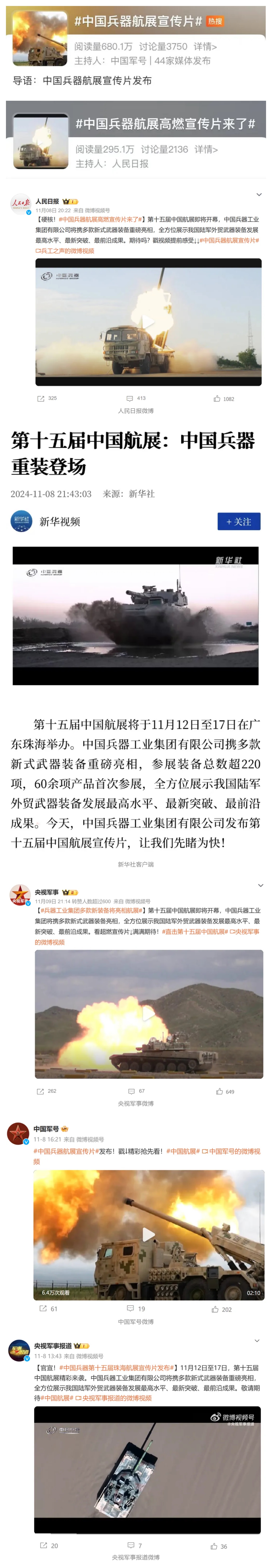 人民日報微博、新華社客戶端、央視軍事微博、中國軍號微博、央視軍事報道微博、中國日報微博、中國新聞網(wǎng)、中國青年報-青蜂俠、環(huán)球網(wǎng)、環(huán)球時報(臉書、X平臺)、學(xué)習(xí)強(qiáng)國中央企業(yè)學(xué)習(xí)平臺、共青團(tuán)中央微博、國資委網(wǎng)站等20余家中央主流媒體、國家部委的新媒體第一時間播發(fā)集團(tuán)公司航展宣傳片等視頻作品燃爆全網(wǎng),累計閱讀量突破1200萬人次。集團(tuán)公司微信公眾號、微博、抖音號、快手號、微信視頻號、知乎號等新媒體宣傳片播放閱讀量近1000萬人次,點(diǎn)贊近20萬人次。