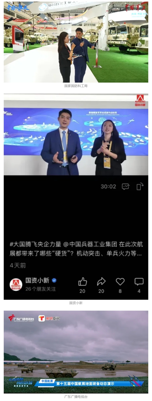 新華社、央視新聞、中央廣播電視總臺中國之聲、央視軍事、中國軍視網(wǎng)、廣東廣播電視臺等媒體以及國家國防科工局、國資小新等到兵器工業(yè)集團(tuán)地面動態(tài)演示區(qū)、中國兵器館進(jìn)行了直播。
