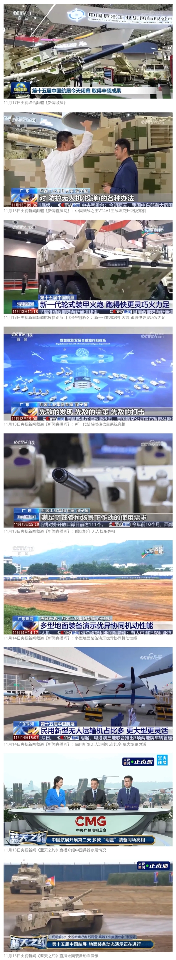 11月13日央視新聞《藍(lán)天之約》直播地面裝備動態(tài)演示此次航展,央視綜合頻道《新聞聯(lián)播》《晚間新聞》、新聞頻道《新聞直播間》《新聞30分》《朝聞天下》《共同關(guān)注》《東方時空》《午夜新聞》、財經(jīng)頻道《天下財經(jīng)》《經(jīng)濟(jì)信息聯(lián)播》《正點(diǎn)財經(jīng)》《第一時間》、中文國際頻道《今日環(huán)球》《中國新聞》、國防軍事頻道《軍事報道》《正午國防軍事》《國防軍事早報》《軍迷行天下》等欄目共播出兵器工業(yè)集團(tuán)參展相關(guān)新聞報道40余條。11月10日央視新聞頻道《新聞30分》11月10日央視中文國際頻道《中國新聞》11月10日央視國防軍事頻道《軍事報道》11月11日央視國防軍事頻道《正午國防軍事》