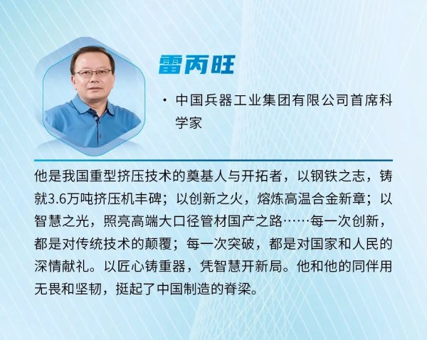 雷丙旺是我國(guó)極端金屬擠壓技術(shù)的開拓者,扎根邊疆地區(qū)國(guó)防特大型企業(yè)工作38年,長(zhǎng)期從事金屬成形制造裝備與工藝研究工作。他研制出我國(guó)極限制造的大國(guó)重器——3.6萬(wàn)噸黑色金屬垂直擠壓機(jī),一舉打破國(guó)外技術(shù)封鎖,填補(bǔ)國(guó)內(nèi)空白,實(shí)現(xiàn)了超(超)臨界電站核心管道和航空發(fā)動(dòng)機(jī)高壓渦輪盤粉末合金棒材的中國(guó)制造,開發(fā)出成套關(guān)鍵技術(shù),取得一系列原創(chuàng)性成果,促進(jìn)了產(chǎn)業(yè)的融合發(fā)展,創(chuàng)造巨大經(jīng)濟(jì)社會(huì)效益。
