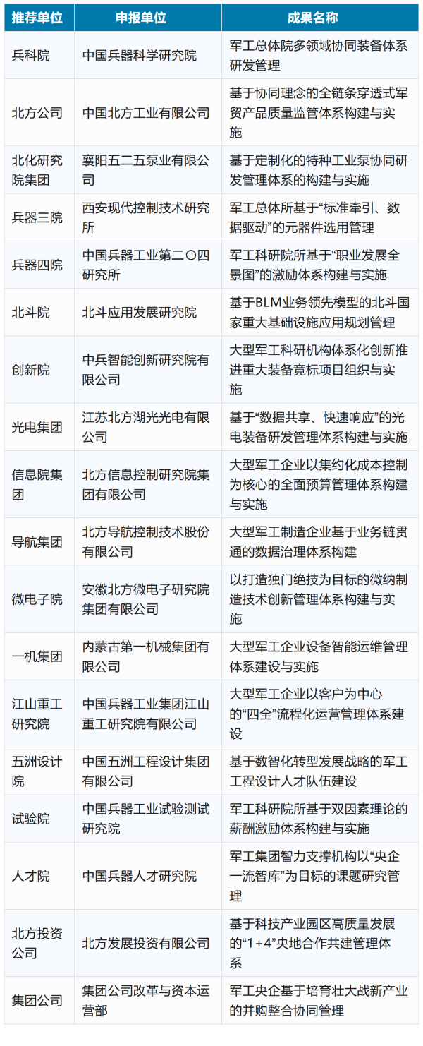 為促進(jìn)管理創(chuàng)新和改革發(fā)展,引導(dǎo)各單位在管理實(shí)踐中運(yùn)用現(xiàn)代管理科學(xué)理論和方法,創(chuàng)新經(jīng)營(yíng)理念,革新管理制度,改進(jìn)管理方式、管理組織、管理方法,營(yíng)造鼓勵(lì)創(chuàng)新、尊重知識(shí)、尊重實(shí)踐、尊重人才的創(chuàng)新環(huán)境。中國(guó)兵器工業(yè)集團(tuán)有限公司組織開(kāi)展了2025年度管理創(chuàng)新成果的申報(bào)、推薦與審定工作。經(jīng)初審、初評(píng)、答辯及終審、公示等環(huán)節(jié),最終評(píng)出獲獎(jiǎng)成果91項(xiàng),其中:一等獎(jiǎng)18項(xiàng)、二等獎(jiǎng)24項(xiàng)、三等獎(jiǎng)49項(xiàng)。 兵器工業(yè)集團(tuán)2025年度一等獲獎(jiǎng)成果名單