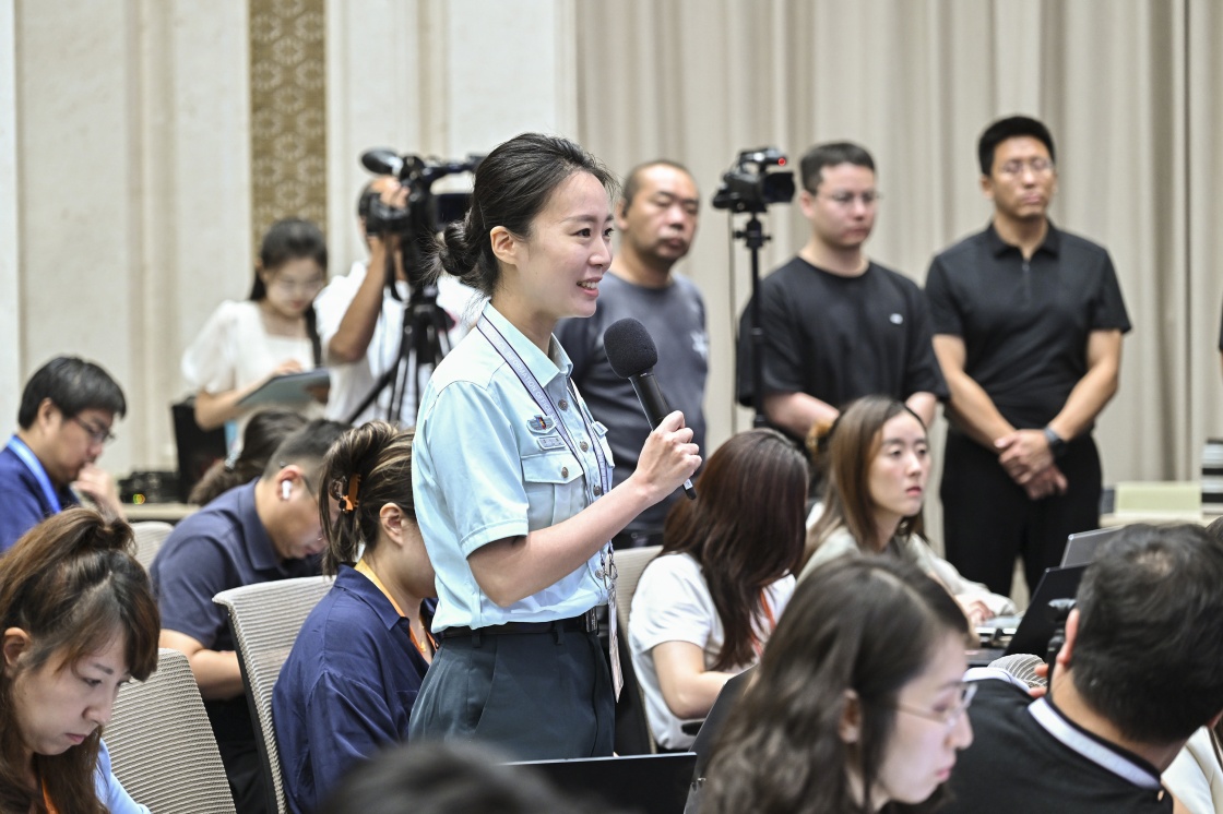 8月20日,國(guó)務(wù)院新聞辦公室在北京舉行新聞發(fā)布會(huì),閱兵領(lǐng)導(dǎo)小組辦公室副主任、中央軍委聯(lián)合參謀部作戰(zhàn)局少將副局長(zhǎng)吳澤棵,中國(guó)人民解放軍中部戰(zhàn)區(qū)閱兵指揮機(jī)構(gòu)辦公室常務(wù)副主任、政治工作部少將副主任徐貴忠介紹閱兵準(zhǔn)備工作有關(guān)情況,并答記者問(wèn)。這是記者在現(xiàn)場(chǎng)提問(wèn)。