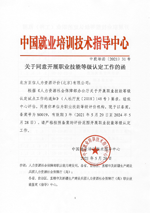 5月28日,人力資源社會(huì)保障部中國(guó)就業(yè)培訓(xùn)技術(shù)指導(dǎo)中心發(fā)布了《關(guān)于同意開(kāi)展職業(yè)技能等級(jí)認(rèn)定工作的函》(中就培函〔2021〕31號(hào)),北方至信人力資源評(píng)價(jià)(北京)有限公司(以下簡(jiǎn)稱“北方至信”)成為首家央企全國(guó)性社會(huì)培訓(xùn)評(píng)價(jià)組織職業(yè)技能等級(jí)認(rèn)定機(jī)構(gòu)。