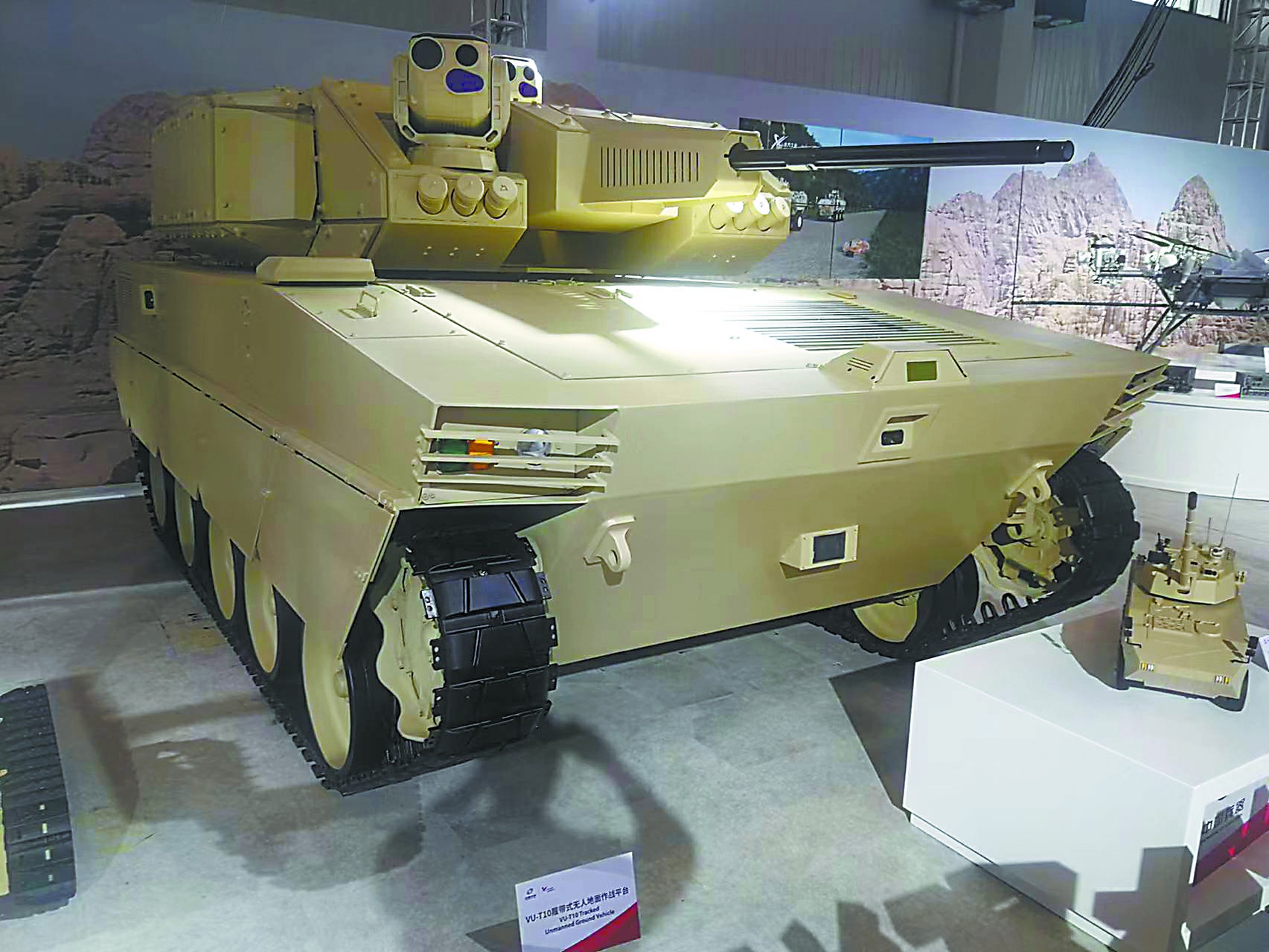 相比各種無人機和巡飛彈,珠海航展上的無人地面作戰(zhàn)車輛在作戰(zhàn)性能上也毫不遜色。除了VT-5U輕型坦克可以臨時客串“無人坦克”外,兵器工業(yè)集團的VU-T10履帶式無人地面作戰(zhàn)平臺也堪稱重型無人車輛。VU-T10主要針對城市環(huán)境作戰(zhàn),選擇采用厚重的履帶式底盤,配備有30毫米口徑遙控武器站,未來還可以根據(jù)需要配備4枚“紅箭-12”反坦克導彈,加載7.62毫米機槍,其武器配備的豐富程度相比俄羅斯BMPT“終結者”火力支援車也不遜色,卻沒有了后者在巷戰(zhàn)中可能遭遇人員傷亡的風險。
