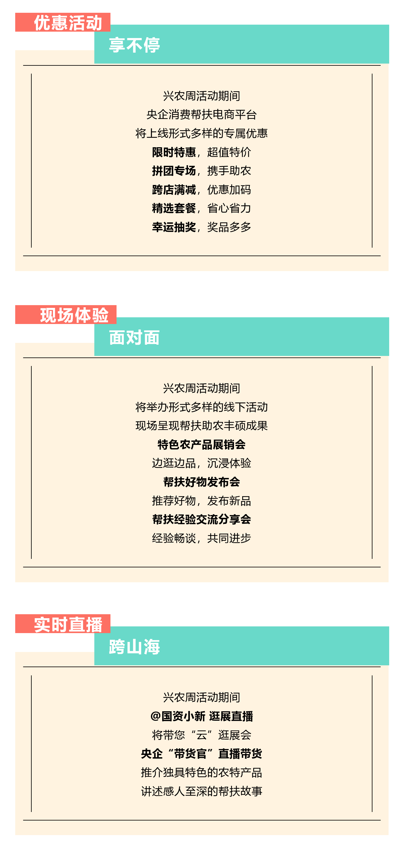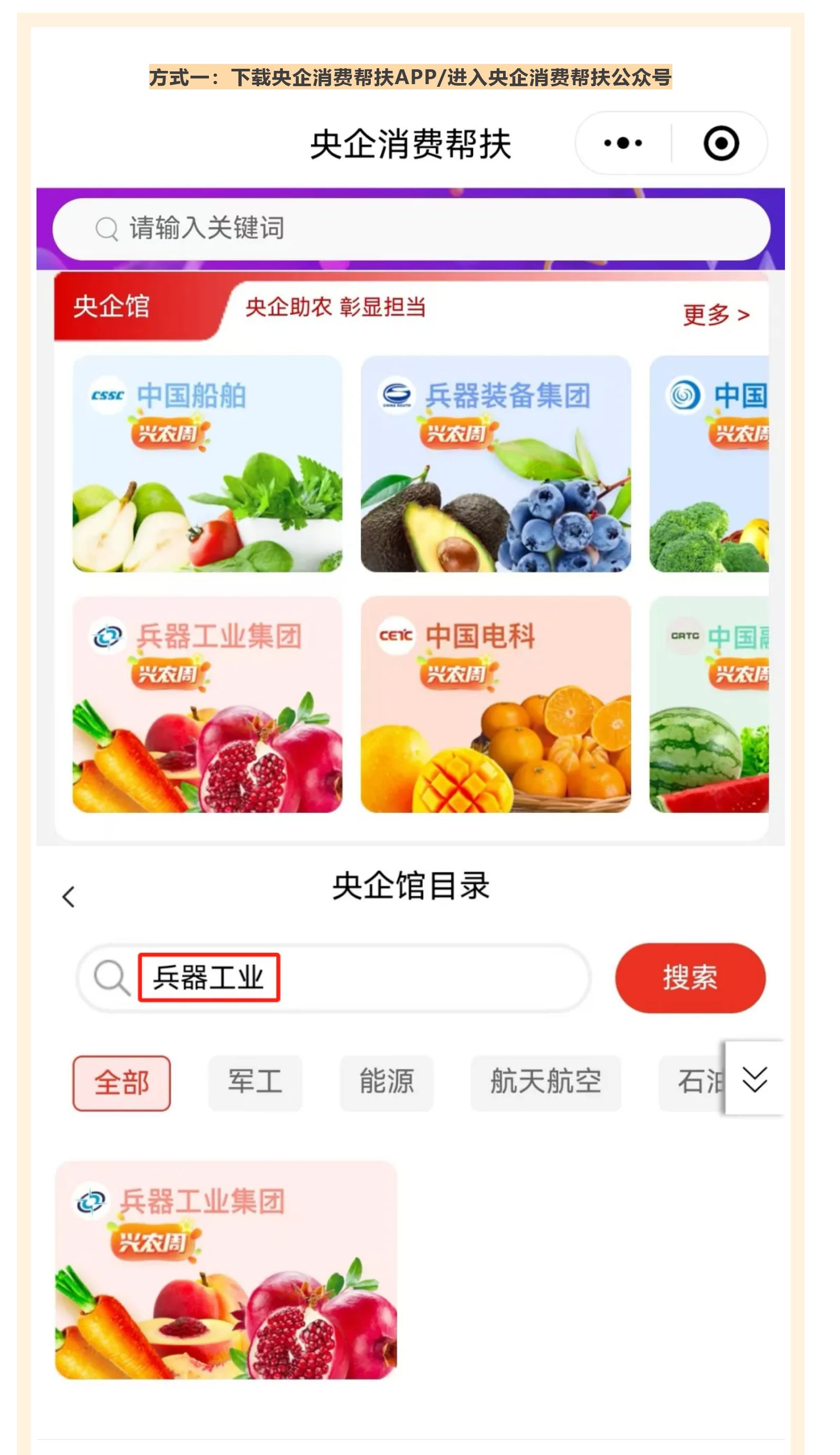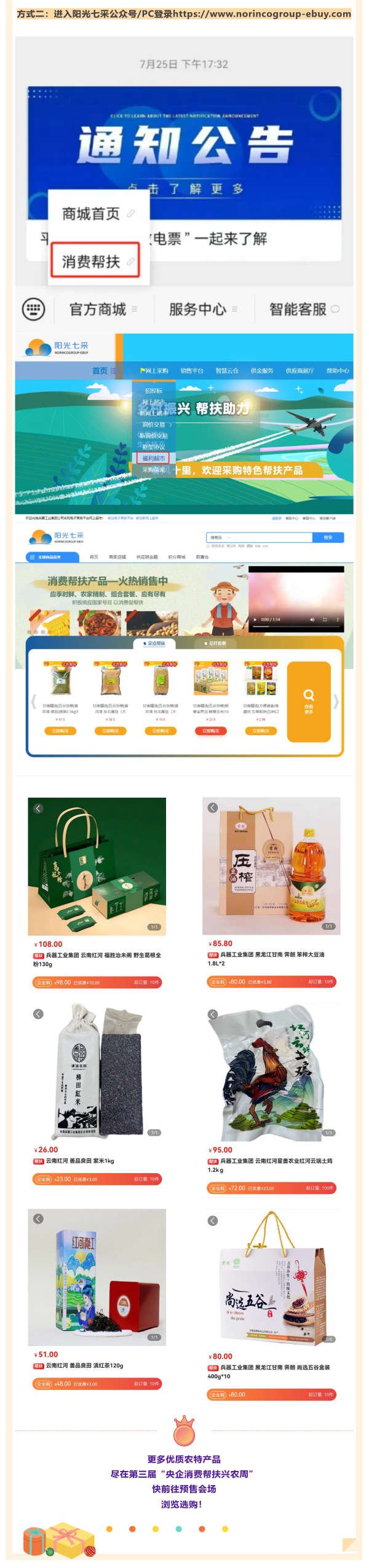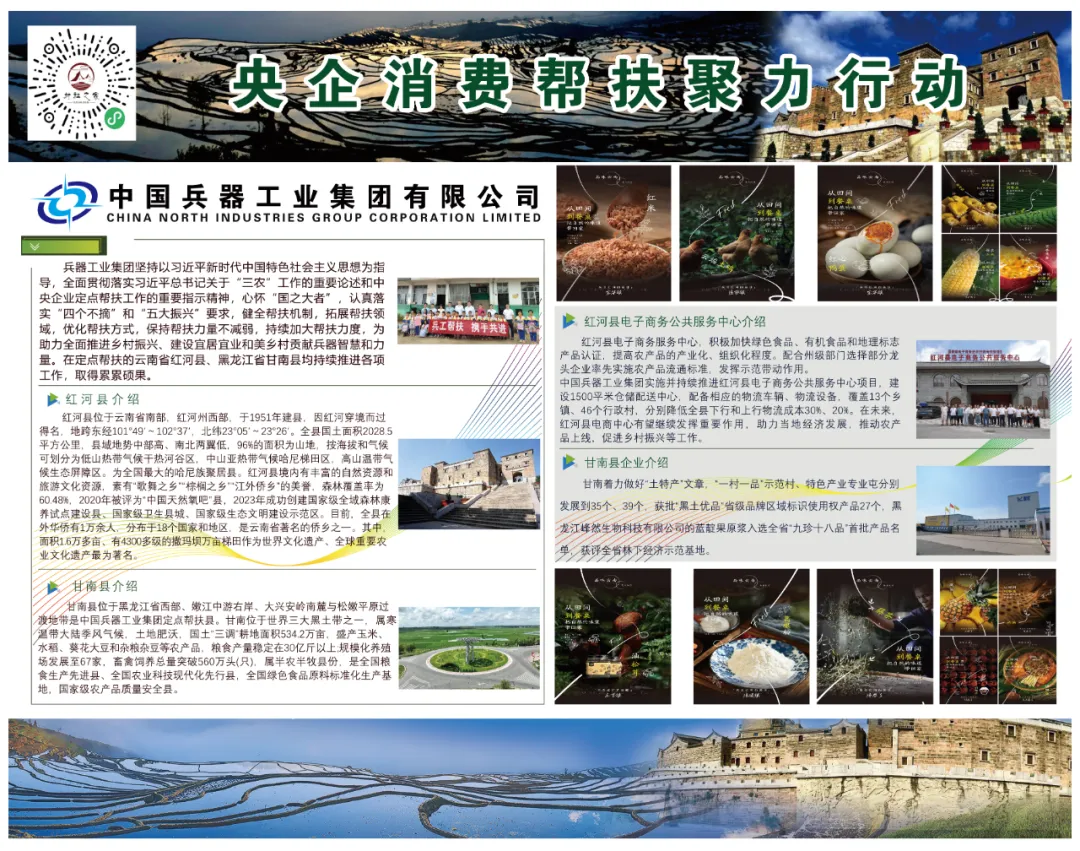 百家央企聚合力 消費幫扶促振興 第三屆“央企消費幫扶興農(nóng)周” 預(yù)售已啟動 8月30日 興農(nóng)周活動將正式開啟 “央企消費幫扶興農(nóng)周”由國務(wù)院國資委社會責任局指導(dǎo),央企消費幫扶電商平臺(國網(wǎng)數(shù)字科技控股有限公司)主辦,國務(wù)院國資委機關(guān)服務(wù)管理局、國務(wù)院國資委新聞中心、國網(wǎng)北京市電力公司、各中央企業(yè)電商平臺聯(lián)合協(xié)辦。 活動以“央企攜手,興農(nóng)惠民”為主題,組織動員中央企業(yè)所屬各單位各部門(特別是工會、食堂)、廣大干部職工、上下游供應(yīng)商和業(yè)務(wù)合作伙伴采購幫扶縣的優(yōu)質(zhì)農(nóng)產(chǎn)品,促進脫貧地區(qū)產(chǎn)業(yè)發(fā)展和脫貧群眾穩(wěn)定增收,鞏固拓展脫貧攻堅成果。 預(yù)售活動火熱開啟 為方便大家提前選購 此次預(yù)售期升級為10天 (8月20日-8月29日) 誠邀下單 兵器工業(yè)集團定點幫扶 黑龍江甘南縣、云南紅河縣 農(nóng)特產(chǎn)品! 8月30日-9月5日 請鎖定“央企館-兵器工業(yè)集團” 我們一起共譜鄉(xiāng)村振興新篇章! |