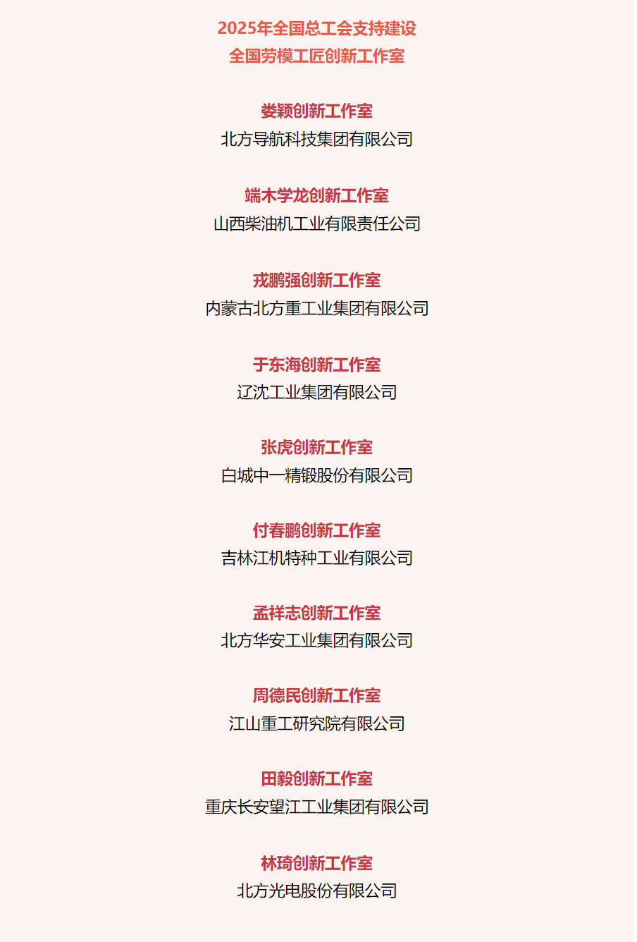 近日,中華全國(guó)總工會(huì)公布2025年全國(guó)總工會(huì)支持建設(shè)全國(guó)勞模工匠創(chuàng)新工作室名單,兵器工業(yè)集團(tuán)10個(gè)勞模工匠創(chuàng)新工作室獲全國(guó)總工會(huì)支持建設(shè)。 來源丨中華全國(guó)總工會(huì)辦公廳 |